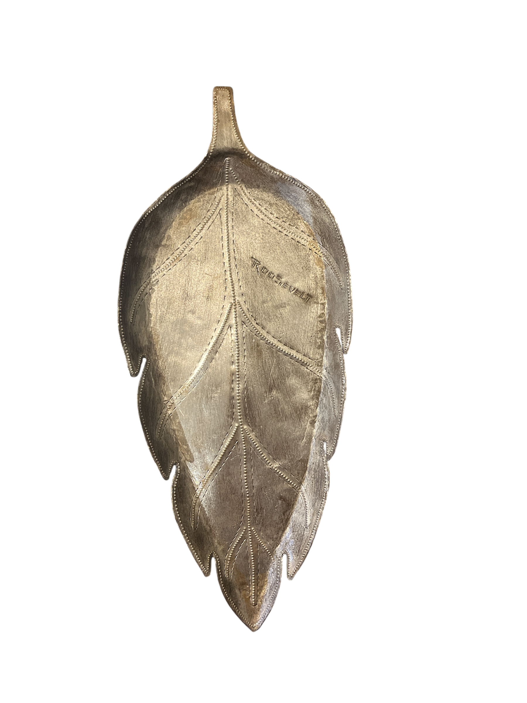 Fat i form av ett löv. Gjort utav återvunnet oljefat som tillverkas av skickliga hantverkare på Haiti.
