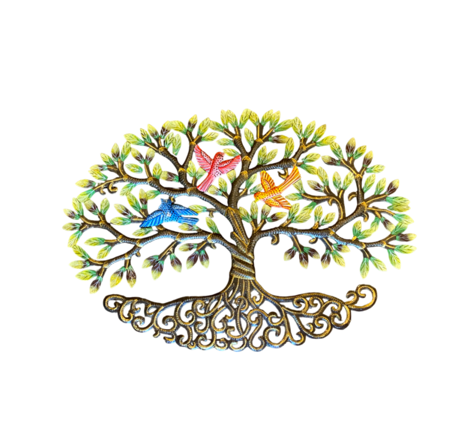 Väggdekoration av återvunna oljefat som tillverkas av skickliga hantverkare på Haiti.
